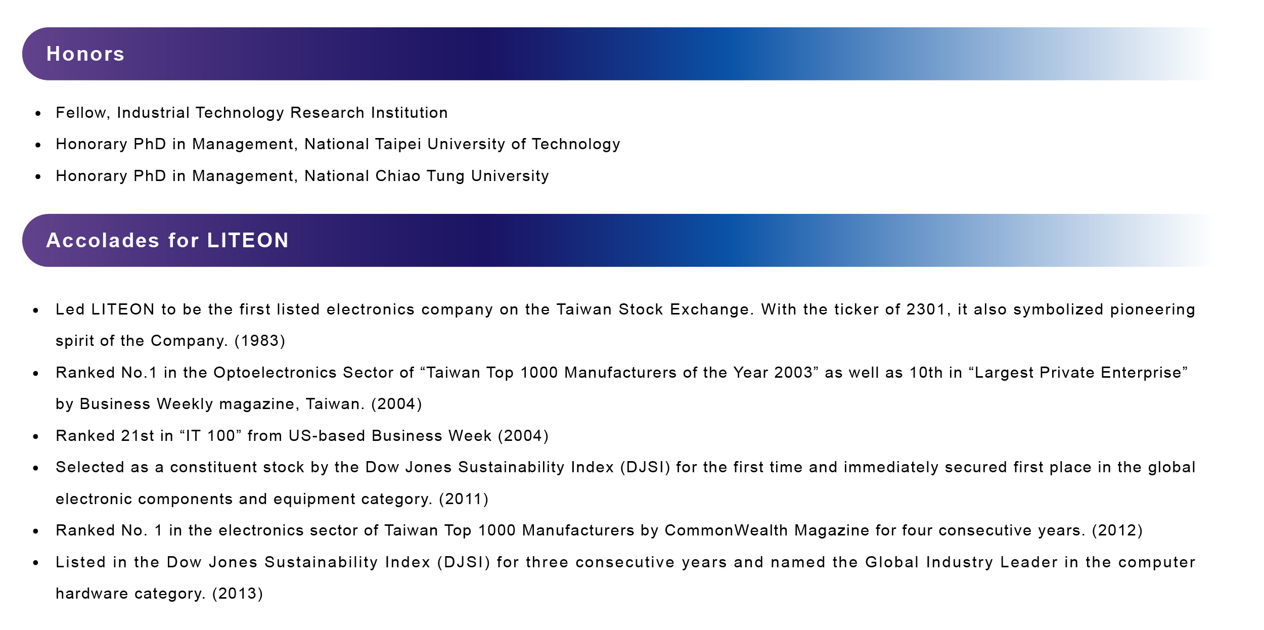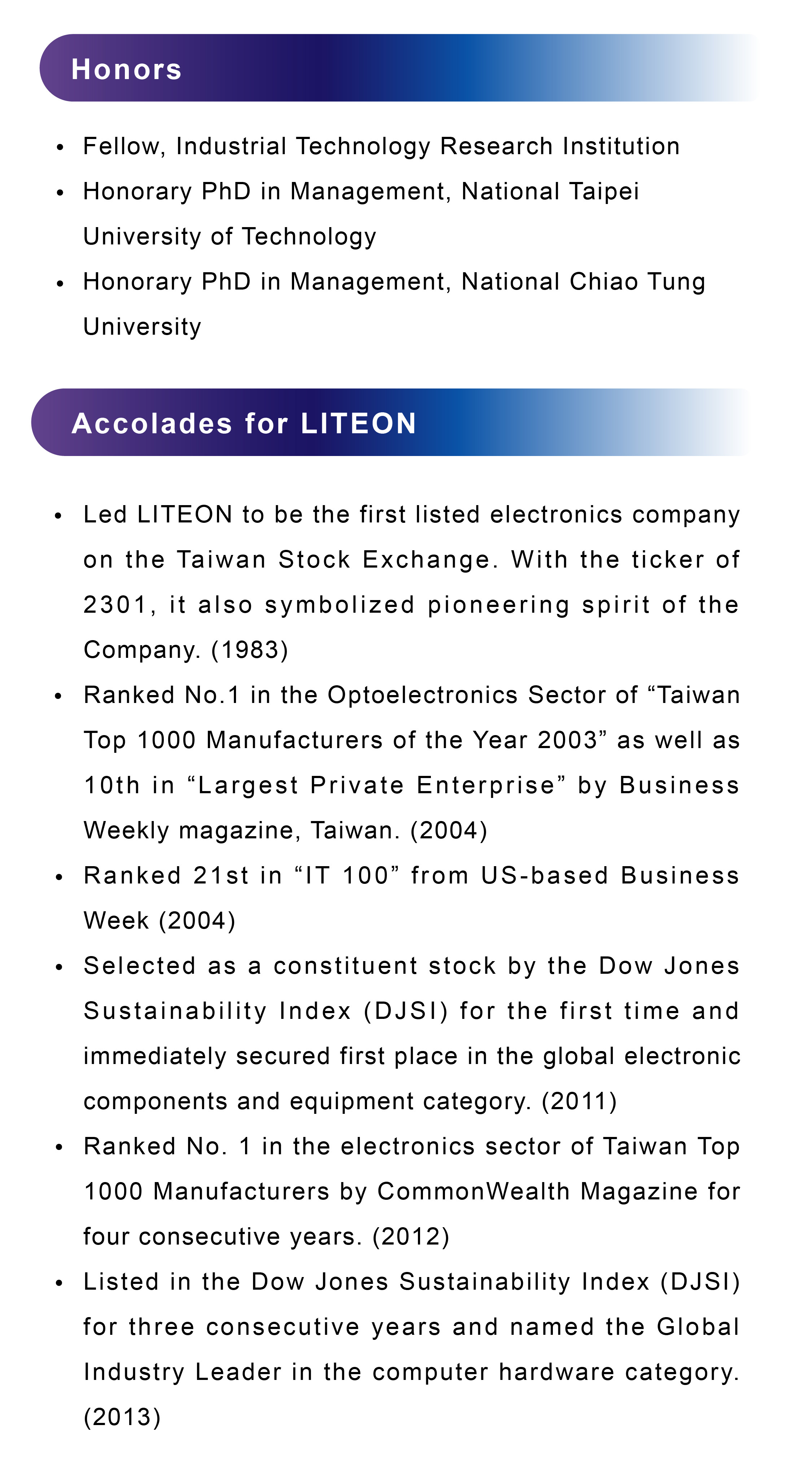 Setting people-centric as the essential spirit of his philosophy, Mr. Soong always put welfare of employees in the first place. On top of effectively integrating group resources and striving for lean management to optimize the business structure and to ensure sustainable development, Soong spends even more efforts to build a pleasant workplace with vitality and prospects. Each member at LITEON could realize their personal career development while working together to fulfill collective goals. Soong led people at LITEON to broaden their visions and achieved numerous milestones, including Nasdaq listing of Diodes Incorporated and launching LITEON Japan, which led the run among the industry in overseas expansion plans. LITEON’s offerings continue to lead the global market share gain and have been honored with multiple No. 1 positions throughout the world. With the motto “Make Every Effort to Achieve Success,” Soong has set high standards and reputation for LITEON.