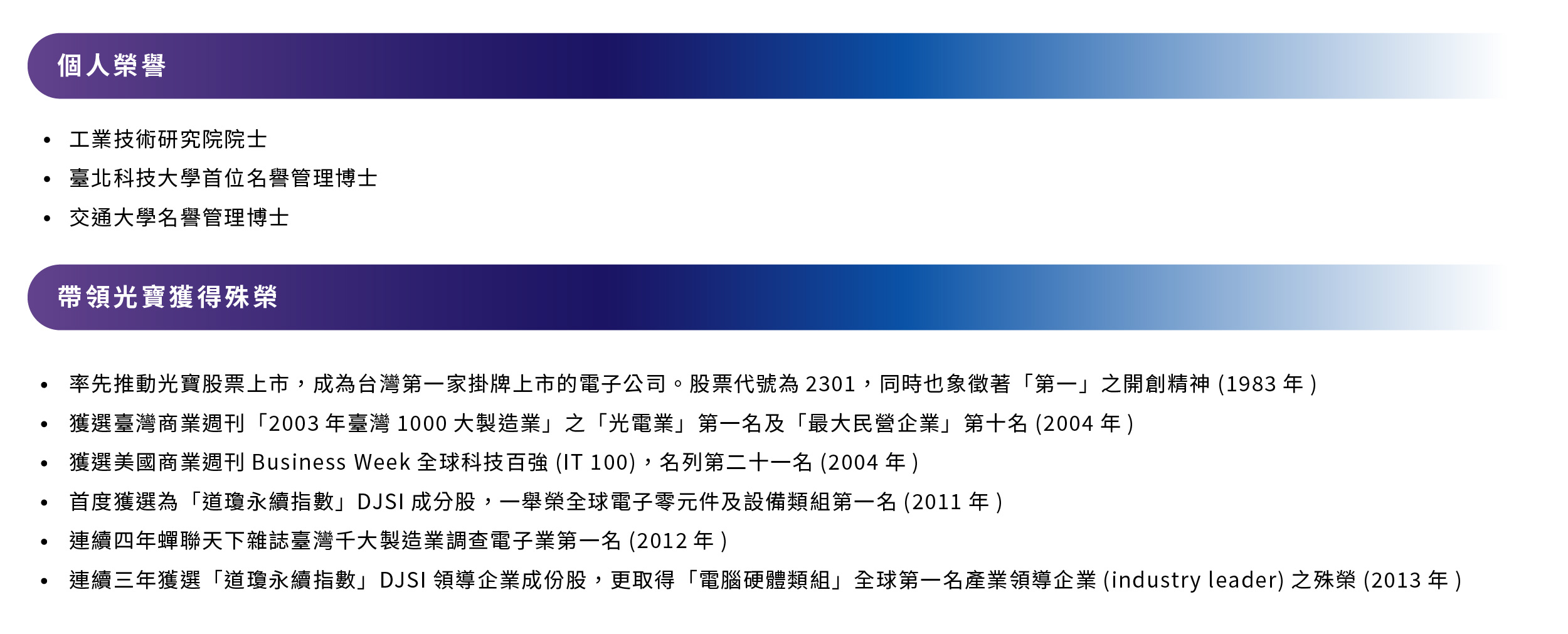 宋先生帶領光寶人勇於開拓視野,締造多項重大里程碑,包括推動達爾科技於Nasdaq掛牌、光寶日本LOJ於日本上市,創下同業海外佈局之嚆矢。集團旗下產品市占率,在全球市場領先群倫,保有多項第一榮耀。宋先生秉持「要做,就要做到最好」的最高品質目標,為光寶團隊立下信譽標竿,屹立不搖。